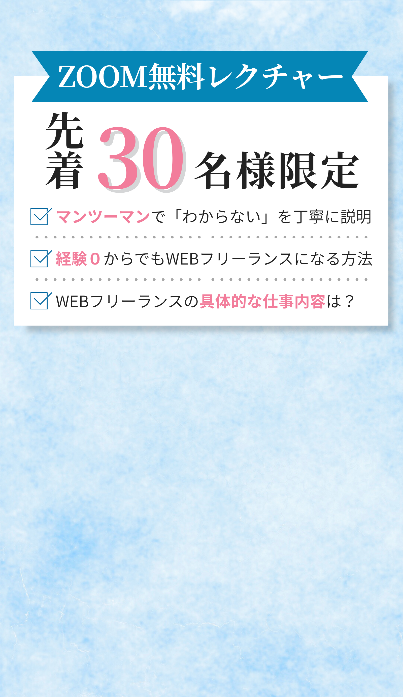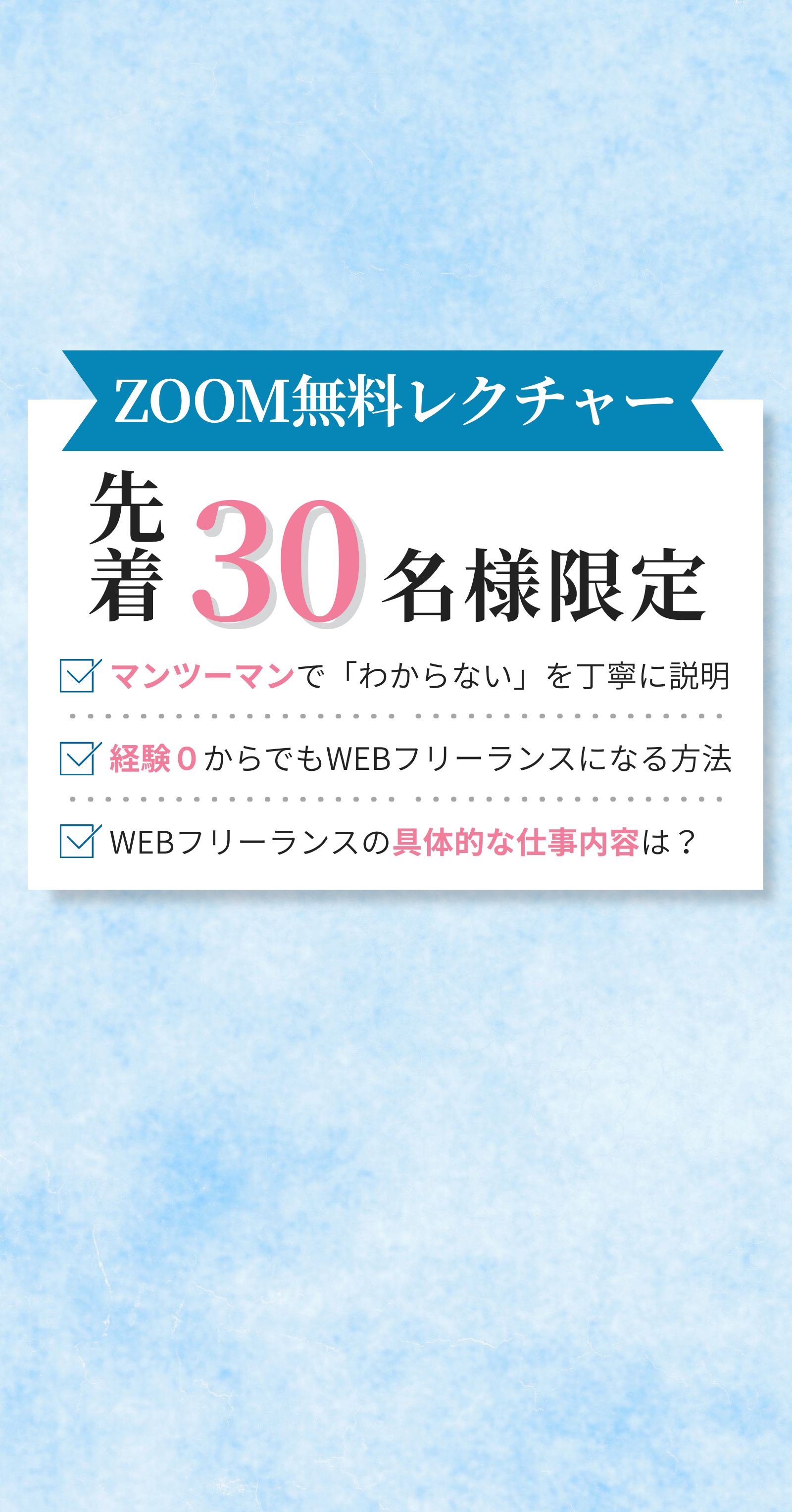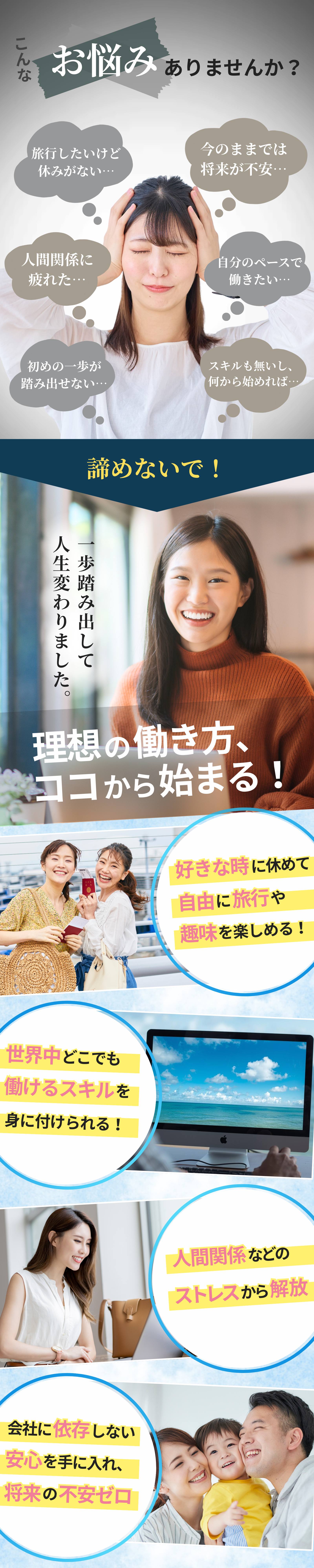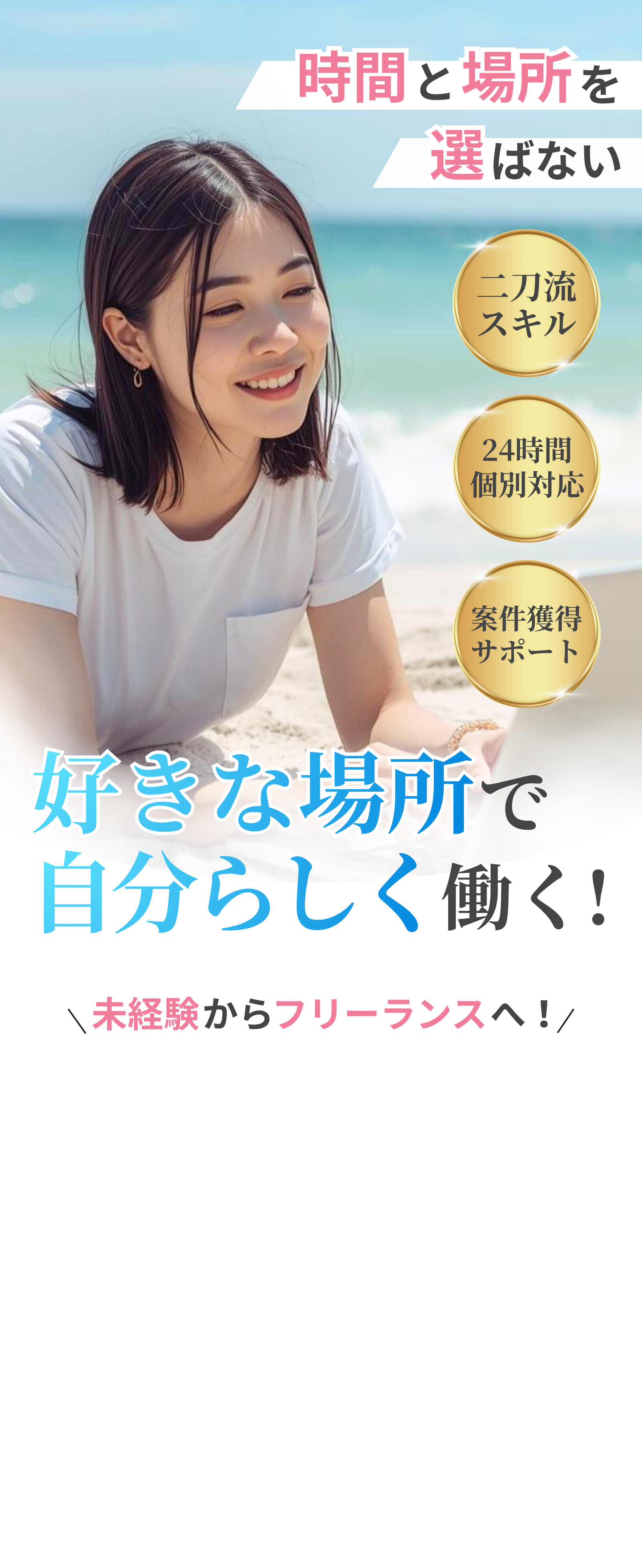 パソコンに慣れていませんが大丈夫ですか? 約9割が未経験からのスタートですので、パソコンに慣れていなくても問題ございません。 仕事と並行しながらでもできますか? その人に合ったスケジュールで学習していきますので、仕事と学習の両立は可能です。実際に受講生の8割以上の方が本業と並行して学習されています。 無料レクチャーの時間はどのくらいですか? 2時間ほどで終わりますので、事前にお時間の確保をお願いいたします。 スマホからでも参加できますか? はい、個別の無料レクチャーはZoomで行いますので、スマホからでも参加可能です。 申し込み後、無料レクチャーのキャンセルは可能でしょうか? 無料枠を確保して個別で行うため、当日のキャンセルはご遠慮ください。どうしても都合が合わない場合は、分かり次第ご連絡をお願いいたします。 特定商取引に基づく表記 プライバシーポリシー Copyright©︎2025 All Rights Reserved.