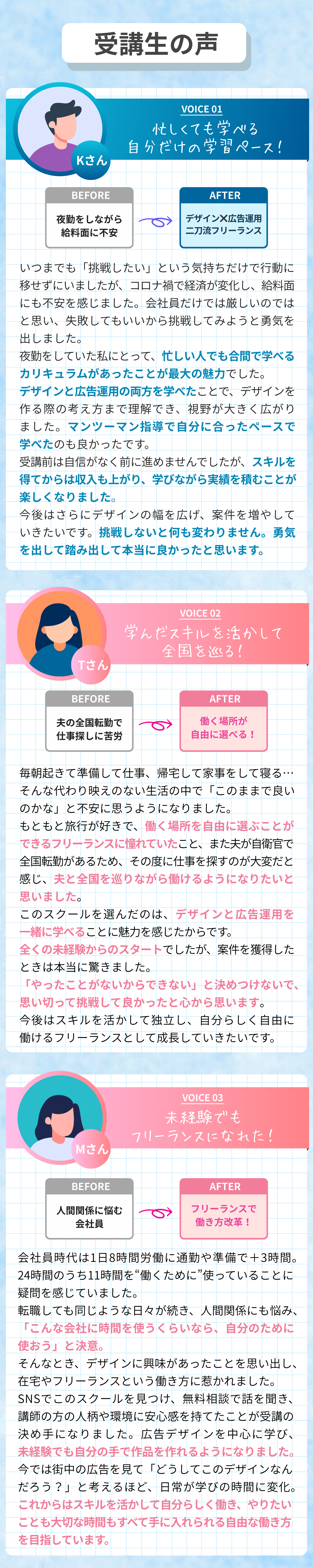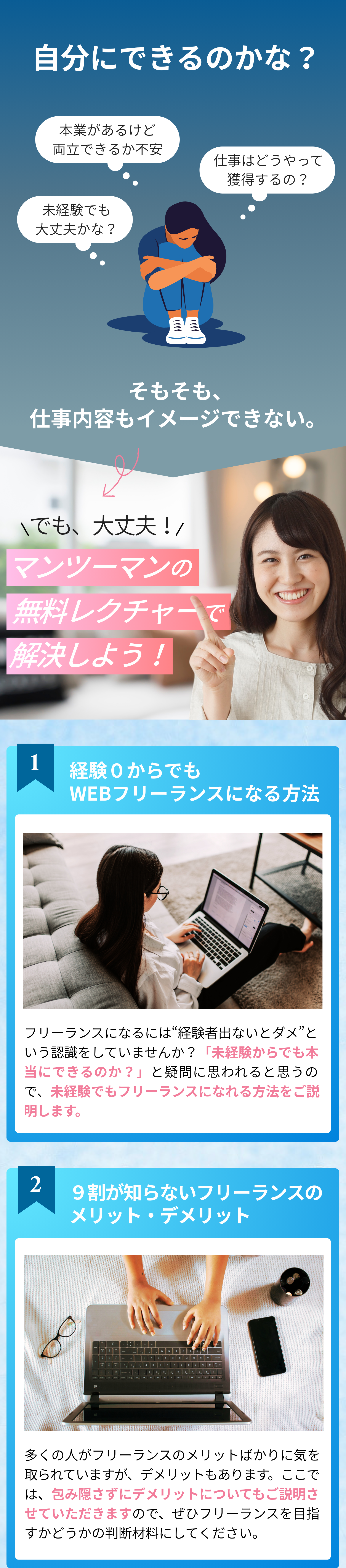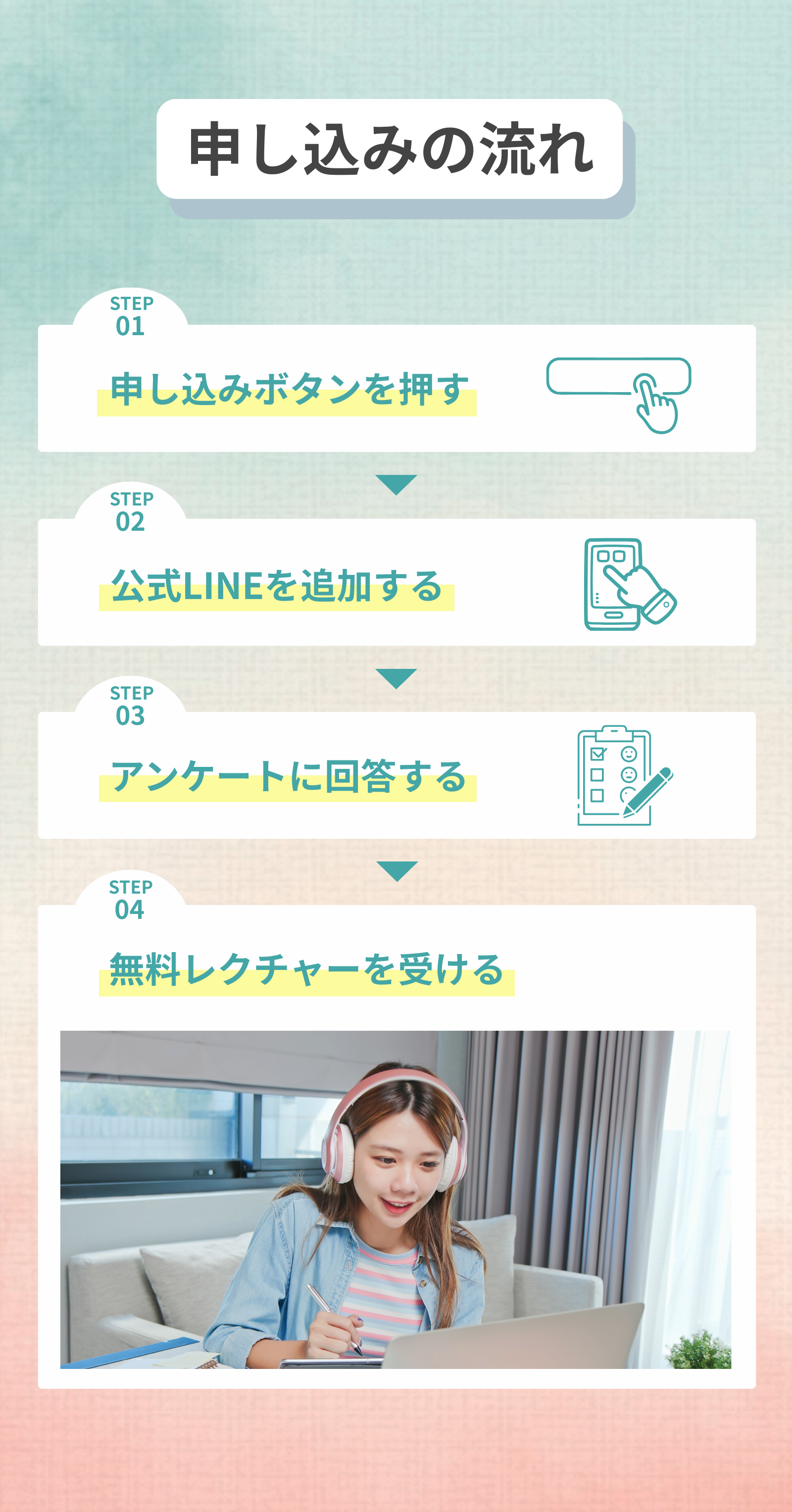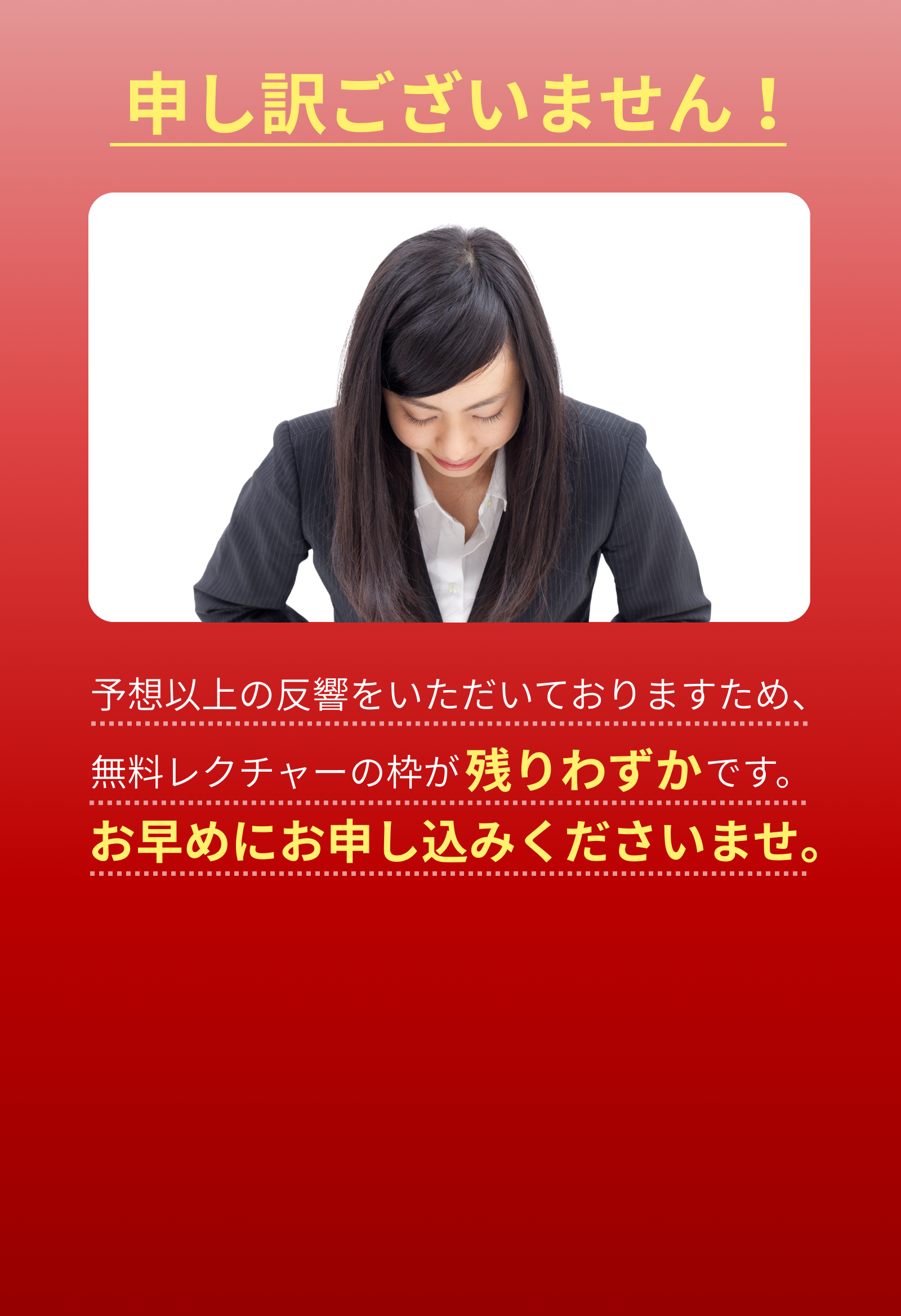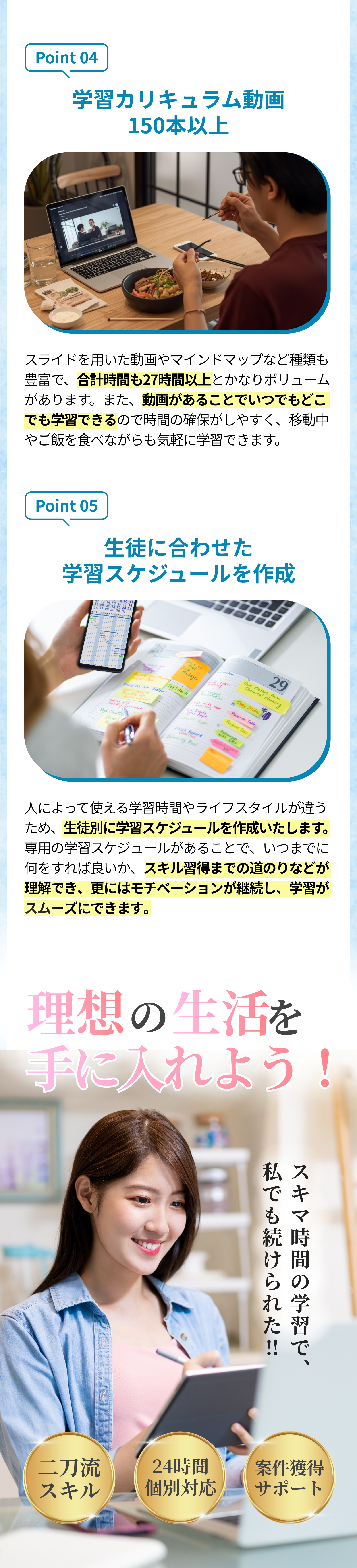 パソコンに慣れていませんが大丈夫ですか? 約9割が未経験からのスタートですので、パソコンに慣れていなくても問題ございません。 仕事と並行しながらでもできますか? その人に合ったスケジュールで学習していきますので、仕事と学習の両立は可能です。実際に受講生の8割以上の方が本業と並行して学習されています。 無料レクチャーの時間はどのくらいですか? 2時間ほどで終わりますので、事前にお時間の確保をお願いいたします。 スマホからでも参加できますか? はい、個別の無料レクチャーはZoomで行いますので、スマホからでも参加可能です。 申し込み後、無料レクチャーのキャンセルは可能でしょうか? 無料枠を確保して個別で行うため、当日のキャンセルはご遠慮ください。どうしても都合が合わない場合は、分かり次第ご連絡をお願いいたします。 特定商取引に基づく表記 プライバシーポリシー Copyright©︎2025 All Rights Reserved.