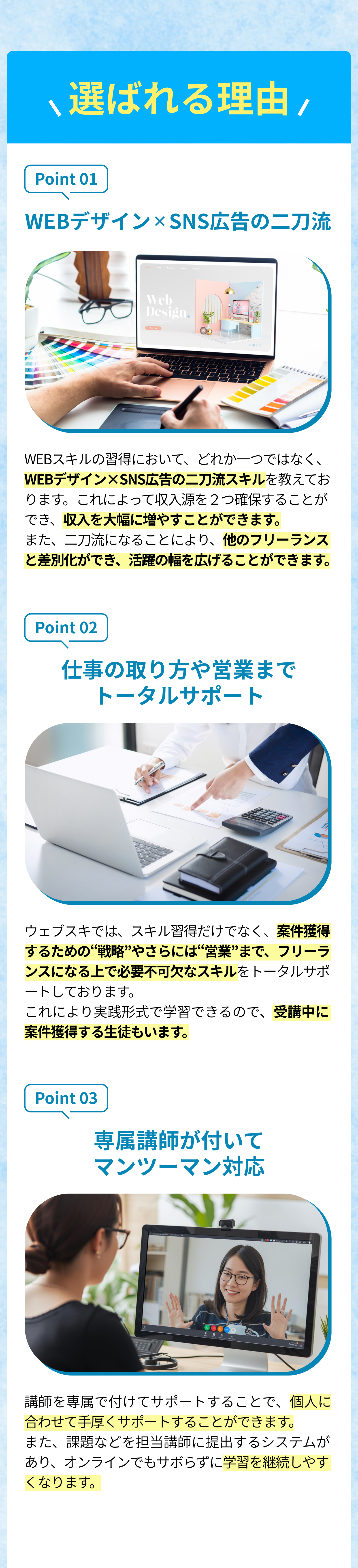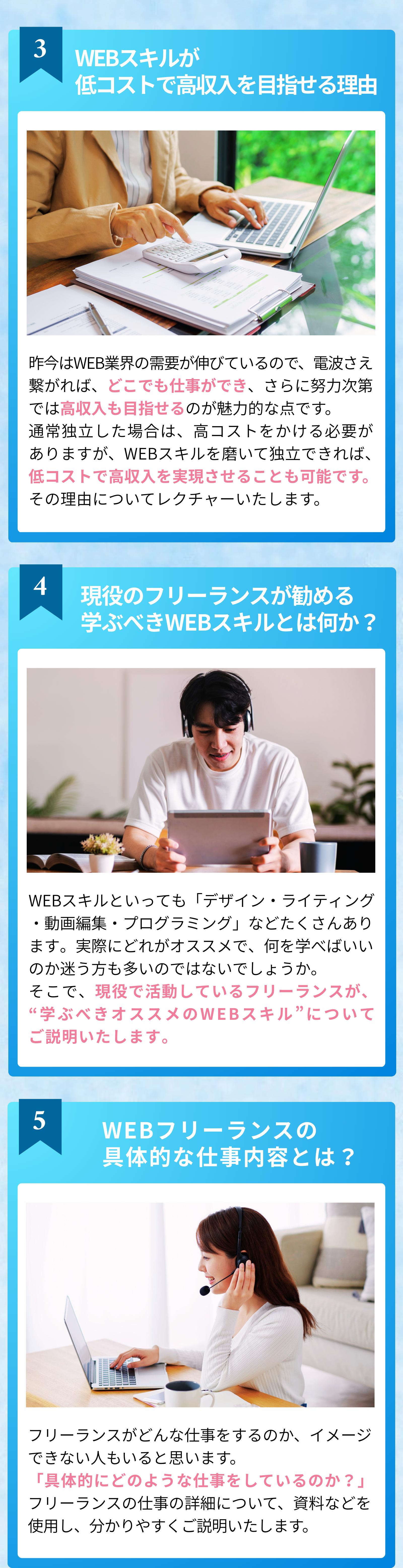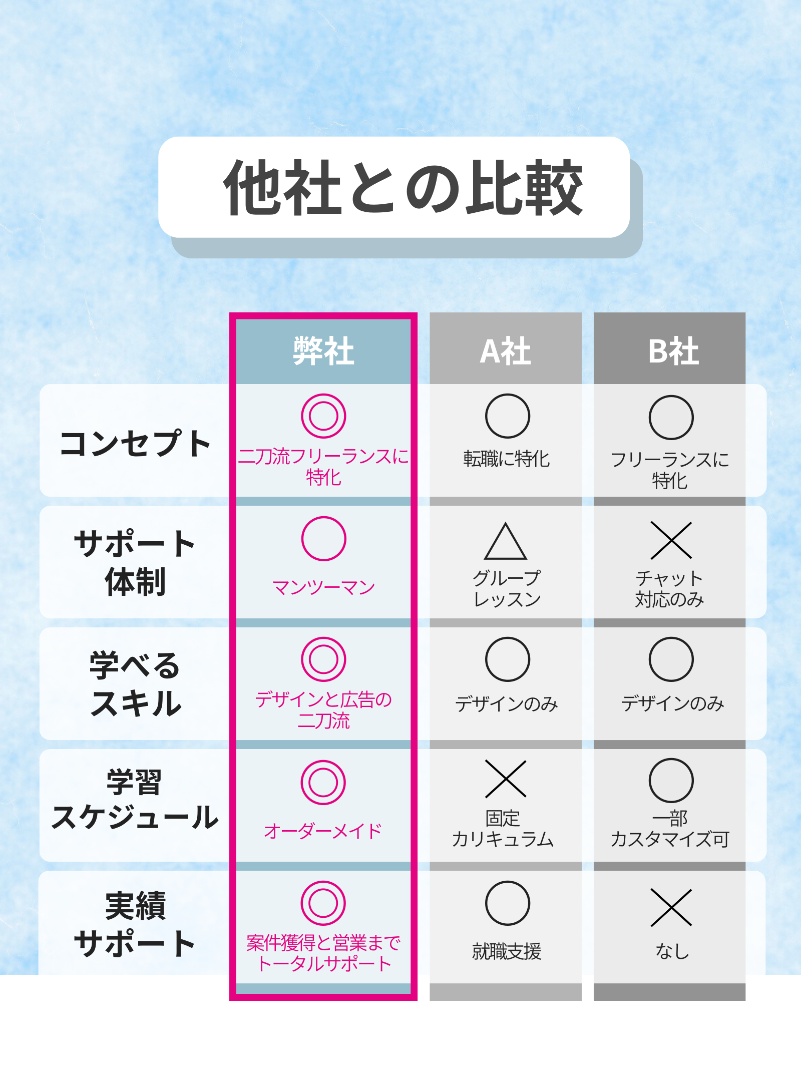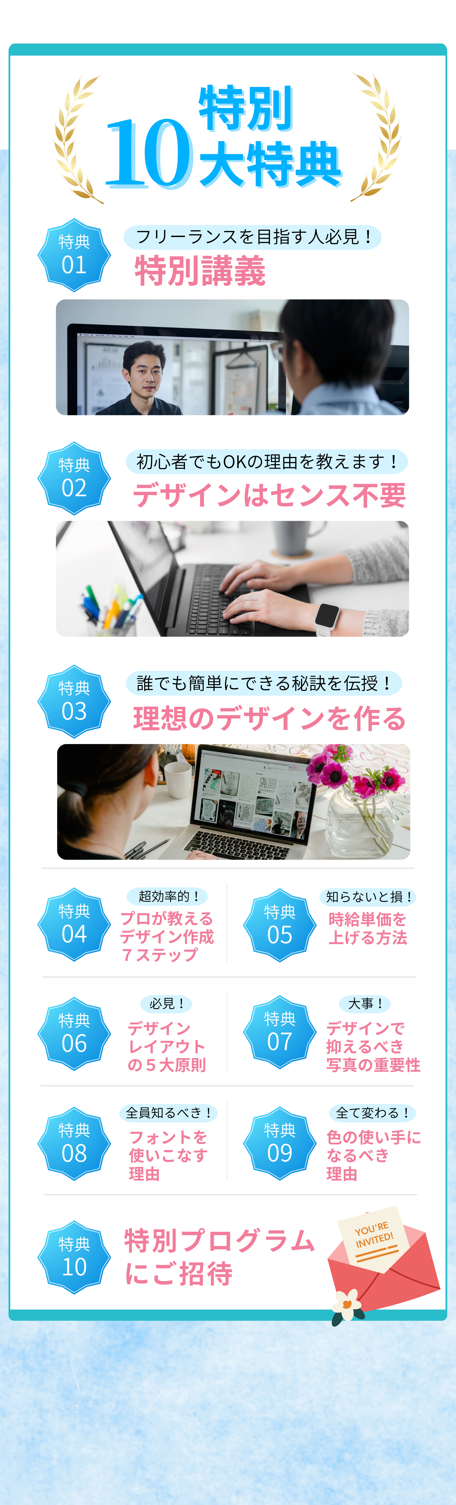 パソコンに慣れていませんが大丈夫ですか? 約9割が未経験からのスタートですので、パソコンに慣れていなくても問題ございません。 仕事と並行しながらでもできますか? その人に合ったスケジュールで学習していきますので、仕事と学習の両立は可能です。実際に受講生の8割以上の方が本業と並行して学習されています。 無料レクチャーの時間はどのくらいですか? 2時間ほどで終わりますので、事前にお時間の確保をお願いいたします。 スマホからでも参加できますか? はい、個別の無料レクチャーはZoomで行いますので、スマホからでも参加可能です。 申し込み後、無料レクチャーのキャンセルは可能でしょうか? 無料枠を確保して個別で行うため、当日のキャンセルはご遠慮ください。どうしても都合が合わない場合は、分かり次第ご連絡をお願いいたします。 特定商取引に基づく表記 プライバシーポリシー Copyright©︎2025 All Rights Reserved.